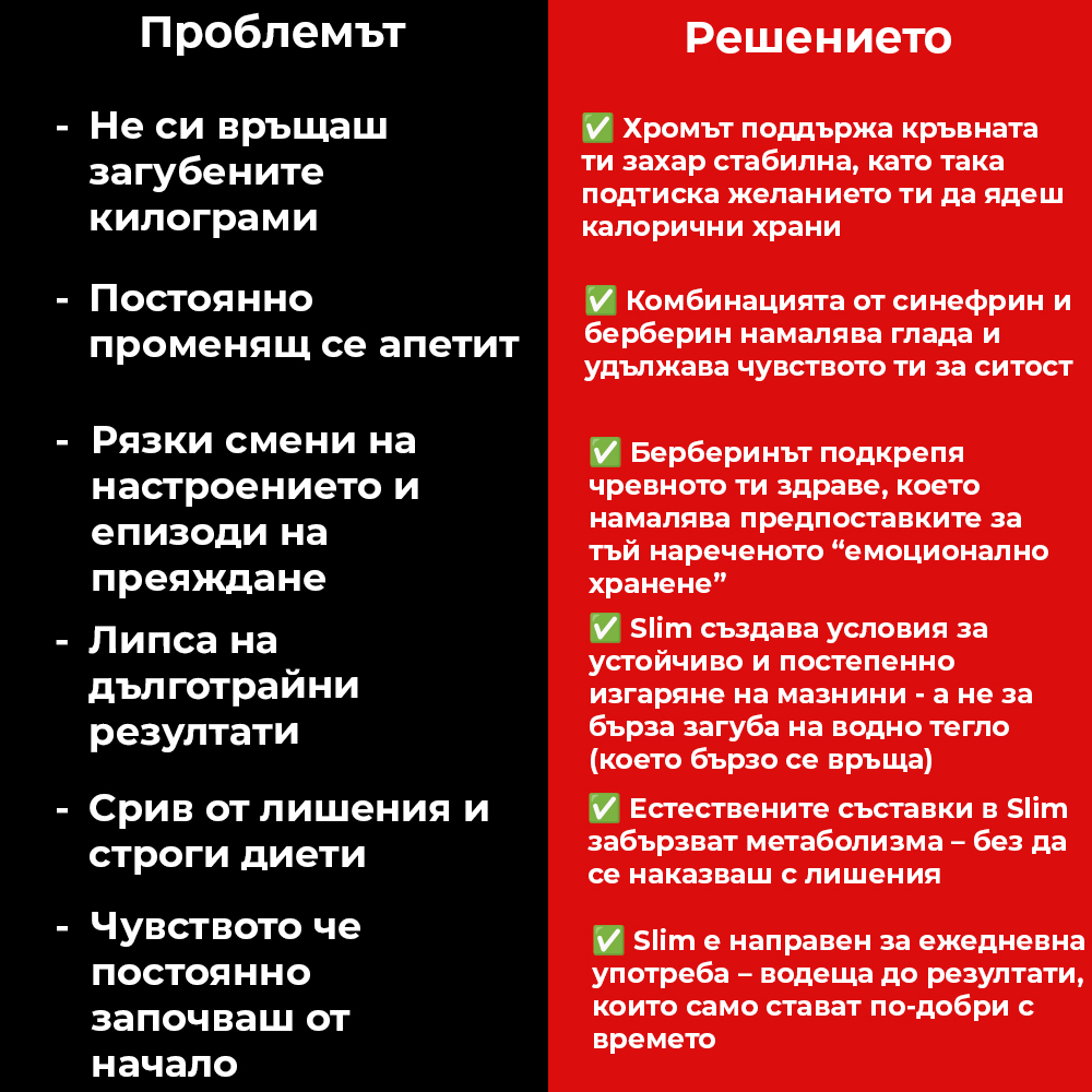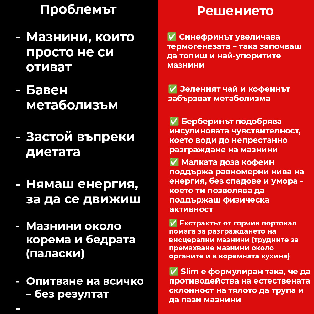 За разлика от много други продукти, Slim води до истински резултати, които ОСТАВАТ. Това е така защото разрешава 3 основни проблема при отслабването. (И затова хората го изкупуват на поразия.)