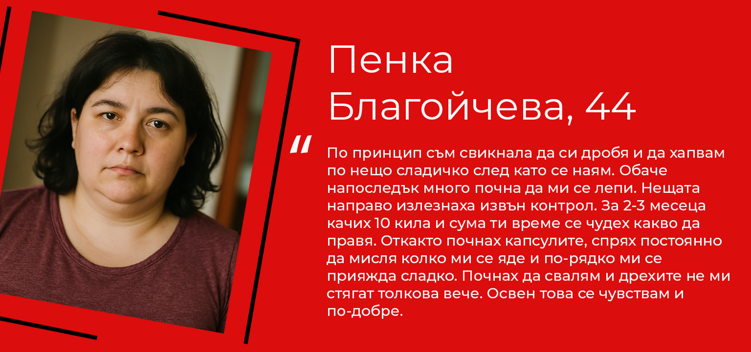 “Преди правех какви ли не щуротии. Взимах едни китайски хапчета и спазвах разни нашумели диети – неща, за които личния постоянно ми се караше. И за какво? НИЩО не успя да ми помогне! Мазнините винаги си оставаха. С тези капсули обаче най-накрая започнах да свалям. Виждам го не само по килограмите, но и когато застана пред огледалото! Чувствам се страхотно! Направо нямам думи! БЛАГОДАРЯ ви че направихте продукт, който наистина работи!“